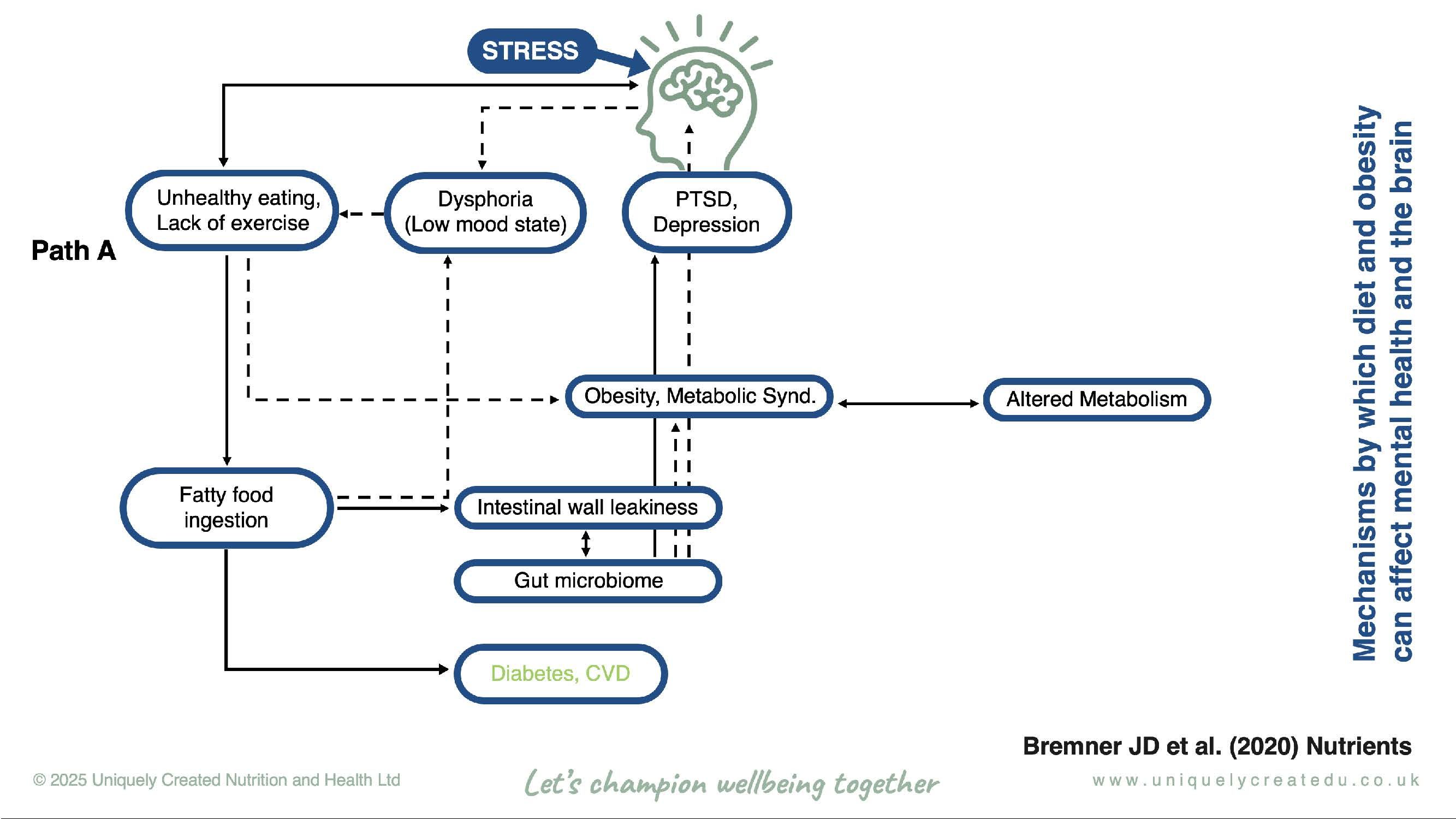 Diet and obesity influence mental health and brain function through multiple interconnected mechanisms. Poor dietary habits, particularly high-sugar and high-fat diets, can trigger inflammation and disrupt insulin sensitivity, which may impair brain regions involved in mood regulation. The gut microbiome, affected by diet, communicates with the brain via the gut-brain axis, influencing neurotransmitter production like serotonin, a key player in emotional well-being. Conversely, chronic stress or mental health disorders can drive unhealthy eating patterns, creating a cyclical relationship between diet and psychological state. Research has found that obesity and metabolic dysfunction may exacerbate these effects by altering brain structure and function, increasing susceptibility to conditions like depression. A balanced diet, such as the Mediterranean diet, appears protective by reducing inflammation and supporting metabolic and cognitive health6.