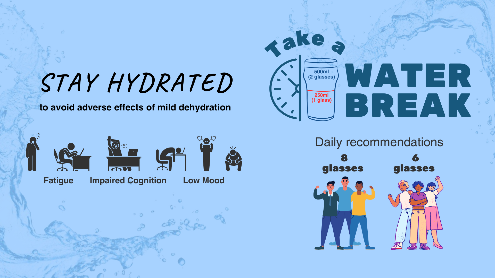 Simple measures like promoting water breaks at the start of lessons and throughout the school day can significantly improve hydration levels. These efforts can enhance cognitive function and create a culture where hydration is prioritised, benefiting both students and staff.